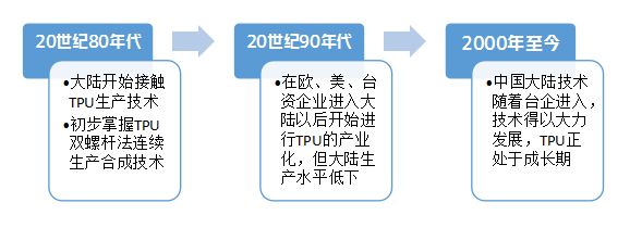 TPU開始由德國拜耳公司于1958年研制成功。隨后,TPU生產(chǎn)技術從日本傳入臺灣。中國大陸從20世紀80年代開始接觸TPU生產(chǎn)技術,但一直未實現(xiàn)研發(fā)與工藝上的突破。大陸地區(qū)從上世紀七八十年代通過“七五攻關”,初步掌握了TPU雙螺桿法連續(xù)生產(chǎn)合成技術,但是由于TPU生產(chǎn)技術門檻高,特別是設備要求和生產(chǎn)管理水平要求高。所以大陸的生產(chǎn)一直在低水平徘徊,研究也沒取得太大的進展,研發(fā)和生產(chǎn)水平一直落后于外資企業(yè)和臺資企業(yè)。